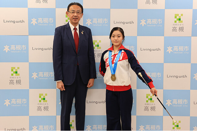 令和7年12月8日(月曜日)、高槻市在住で高校2年生の阿久根あかりさんが高槻市役所を訪問し、8月にイタリア・トリノで開催されたバトントワーリングの世界大会「2025年IBTF世界テクニカルバトントワーリング選手権大会」に出場し、見事金メダルを獲得したことを濱田剛史市長に報告しました。