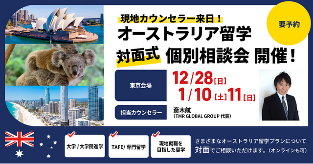 この説明会では、オーストラリア在住のスタッフが来日し、東京、オンラインにて個別相談を実施。将来的な大学進学・留学から永住権取得・現地就職を見据えた留学プランについて、参加者の状況に応じて具体的にご案内いたします。
