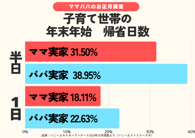 パパ実家への帰省は半日から1日の日帰りが多く、ママ実家への帰省は「3泊4日」「4泊5日以上」でパパ実家への帰省を上回りました。