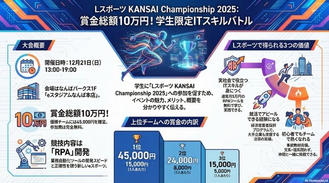Lスポーツは、「Learning(学び)をSports(スポーツ)に」 をコンセプトにAI・ITスキルを競技形式で楽しく身につける新しい学びの文化です。過去、東京を中心に全国で開催されており、今回の関西大会は 関西エリアでの初の公式開催となります。競技テーマは、実務でも使われる業務自動化ツール RPA(MICHIRU RPA)。3人1組のチーム戦で、開発スピード × 正確さ を競います。