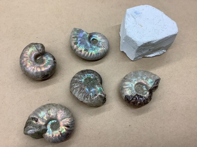 ・化石取り出し:石膏でできた石の中から2~3cmの化石(虹色アンモナイト)を取り出します。