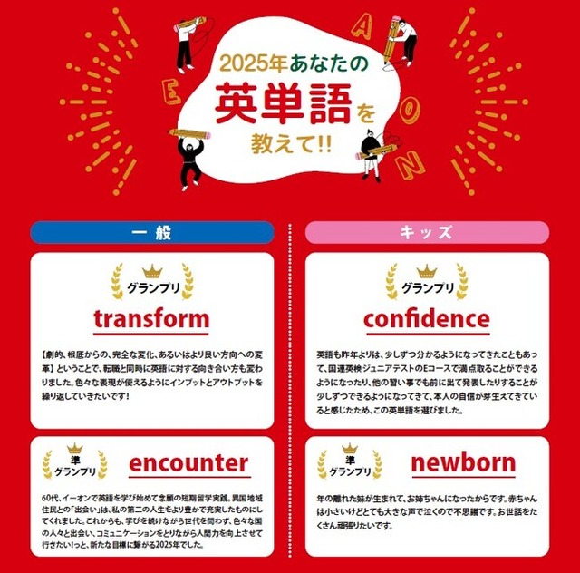 英会話教室を運営する株式会社イーオン(本社:東京都新宿区、代表取締役社長:重野卓、以下「イーオン」)は、イーオン、イーオンキッズにお通いの生徒様を対象に、2025年10月14日~11月30日の期間中、様々なエピソードとともに2025年を象徴する英単語を募集しました。英単語を選んだ理由では応募者の皆様の様々な想いを綴ってくださいました。その中からイーオンの教師をトレーニングする教務トレーナーが、一般(高校生以上)部門、キッズ部門それぞれにおいてグランプリ・準グランプリを決定しました。