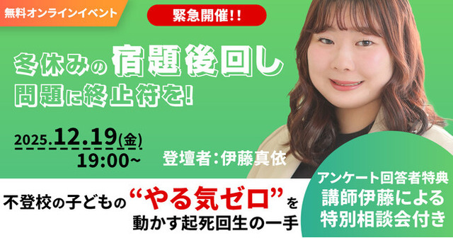 2025年12月19日(金)19:00~19:30、キズキ共育塾(※)は「冬休みの課題を後回しにしてしまう不登校のお子さん」について悩む保護者様を対象に、無料のオンラインイベントを開催します。