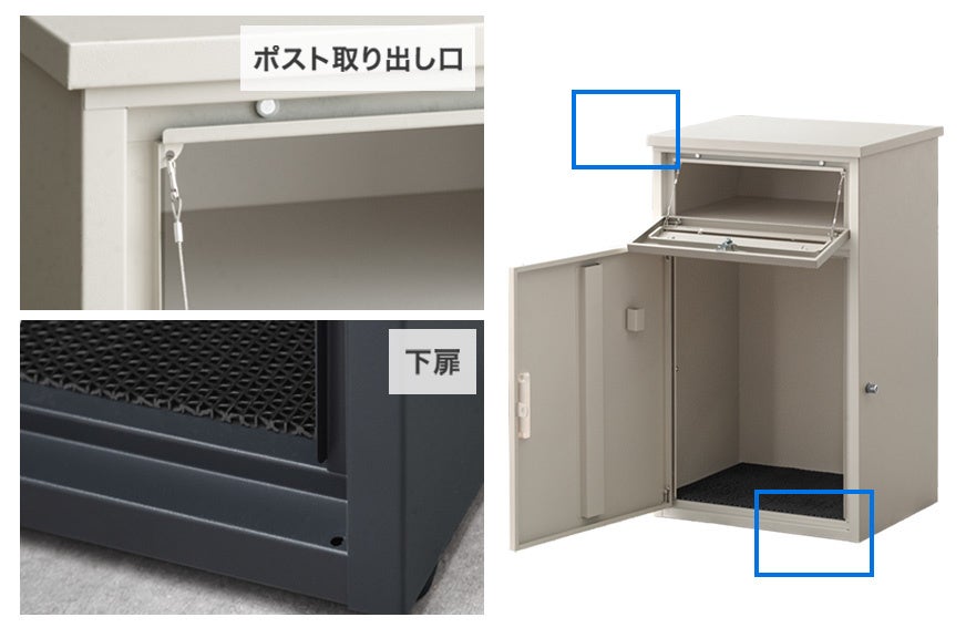 下扉には、押すだけで鍵を閉めることができるプッシュキーが搭載されています。複雑な操作が不要なため、配達員の方が使いやすい設計となっており、安全に使用することができます。