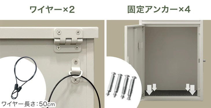 安心・安全面としては、ワイヤーおよびアンカー固定の両方に対応しており、設置環境に合わせた設置が可能です。屋外に設置する際の盗難防止はもちろん、強風や衝撃による転倒リスクも軽減し、安全性を高めています。