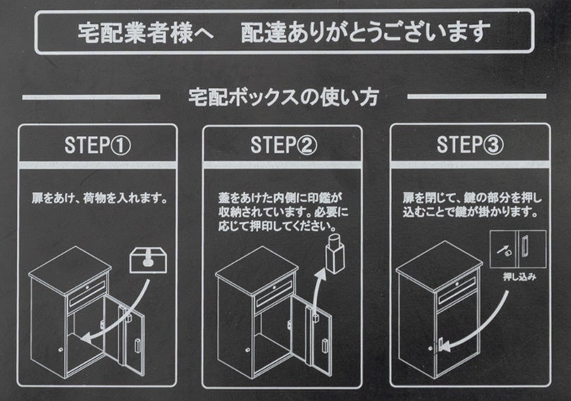 また、配達員の方が荷物を入れてから施錠まで迷わず使えるメッセージプレートと、受領印の押印に便利な印鑑ホルダーを付属しており、外出時にも受取人・配達員双方にとってスムーズな荷物の受け取りをサポートします。