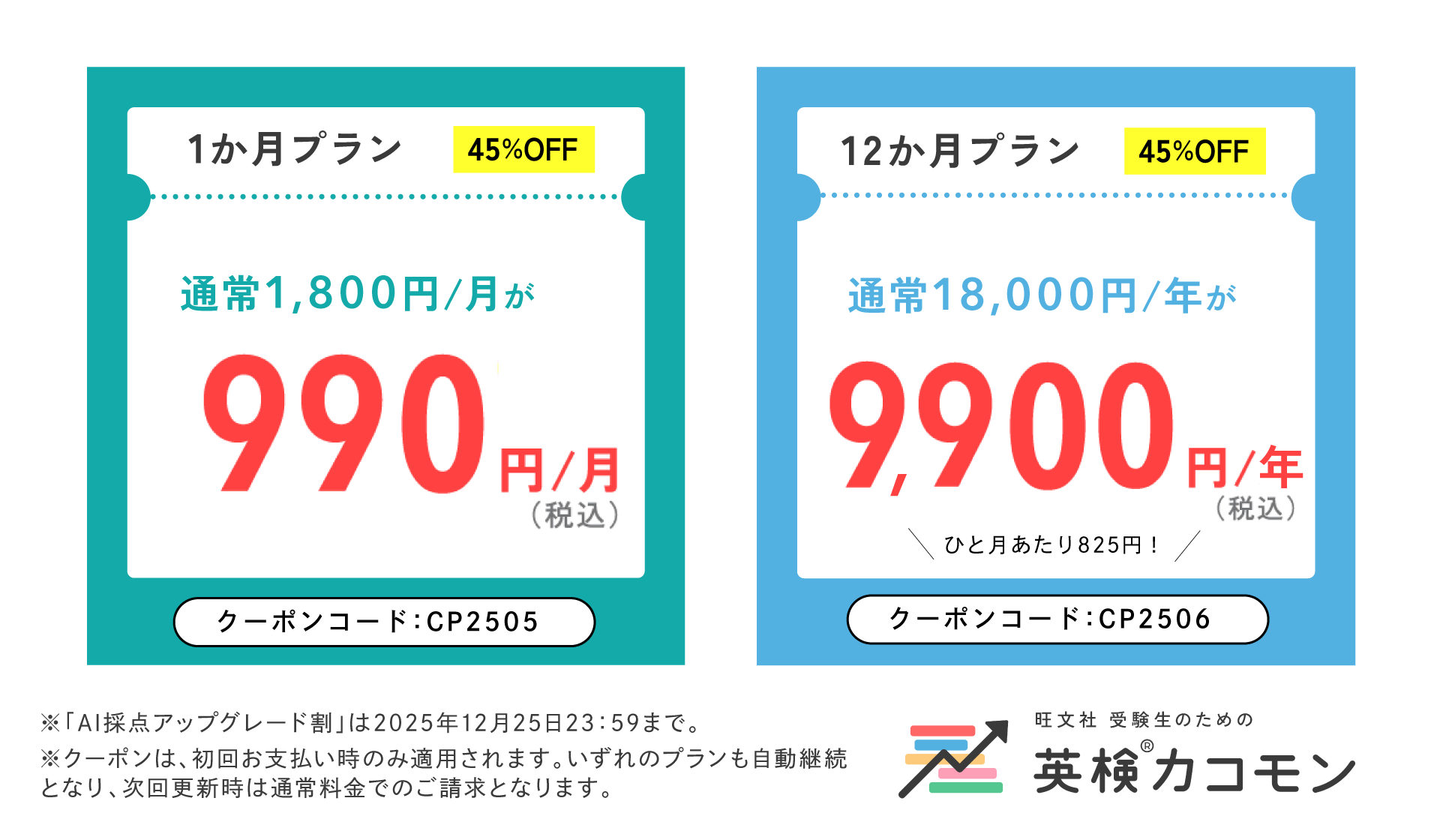 「受験生のための英検(R)カコモン」にライティングAI採点公式版が搭載されたことを記念した、おトクなキャンペーンを2025年12月25日まで開催中です。