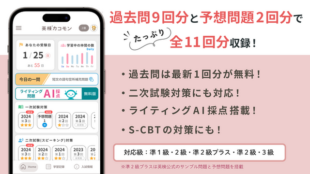 教育出版社の株式会社旺文社(東京都新宿区、代表取締役社長 粂川 秀樹)は、実用英語技能検定(以下、英検)の過去問学習ができるwebサービス「受験生のための英検(R)カコモン」(準1級~3級対応)に、2025年12月17日より新規予想問題を搭載するアップデートを行いました。より多くの問題で英検対策を可能にし、英検合格に向けて学習するみなさまを応援いたします。無料公開中のライティングAI採点では、引き続き2024年度第3回過去問のライティング解答の採点・添削が可能です。