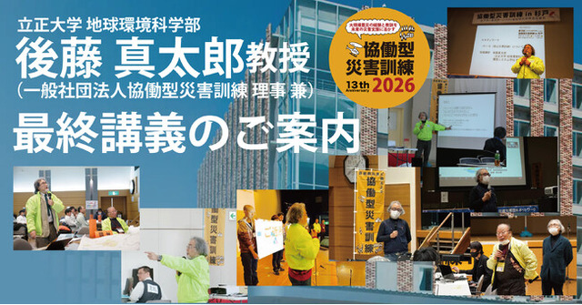 2014年国土交通省「広域的地域間共助推進事業」としてスタートし、「これまでの震災の経験と教訓を、来るべき大規模災害に活かすこと」をモットーに毎年開催を重ねている一般社団法人協働型災害訓練(本社:埼玉県東松山市、代表理事:とよしま亮介)に、多大なるご尽力を賜り、協働型災害訓練を一緒に作り上げて来てくださった立正大学 地球環境科学部 後藤真太郎教授(一般社団法人協働型災害訓練 理事 兼)が2026年3月末日をもってご退職されることになり、最終講義が下記の通り行われます。