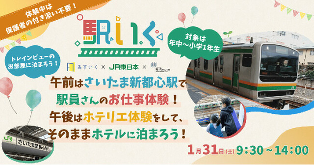 一時保育検索・予約サービス「あすいく」を運営する株式会社あすいく(代表取締役:幸脇啓子)、JR 東日本スタートアップ株式会社(代表取締役社長:柴田裕)、東日本旅客鉄道株式会社大宮支社(執行役員大宮支社長:石井剛史)、日本ホテル株式会社ホテルメトロポリタンさいたま新都心(総支配人:櫻井浩一)は連携して、「駅いく in さいたま新都心駅員&ホテリエ職業体験・自由時間ステイ」を