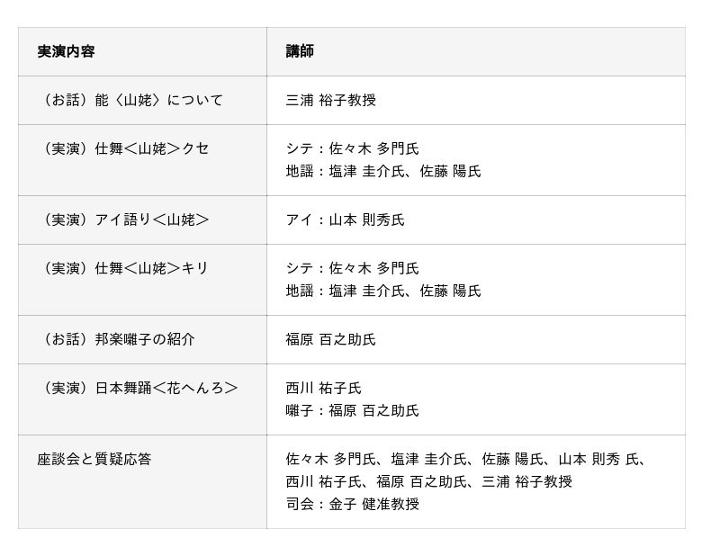 統芸能で描かれる「山姥(やまんば)」をテーマに研究発表を行いました。続いて、プロの能楽師と日本舞踊家から能と日本舞踊の実技の指導を受け、最終回に「能〈山姥〉の仕舞と狂言語り」および「日本舞踊〈花へんろ〉」の実演を鑑賞しました。