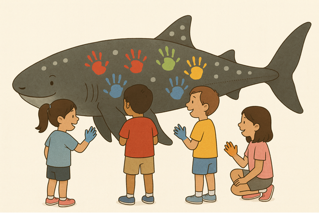 来る1月20日(火)9:30~12:00、姫路市立八木小学校にて、当社の若手社員が設計・製造した全長約2メートルの「鉄の巨大ジンベイザメ」のオブジェに、八木小の全生徒(92名)が色とりどりの絵の具で手形をつけて完成させるアートイベントを実施しますのでお知らせします。