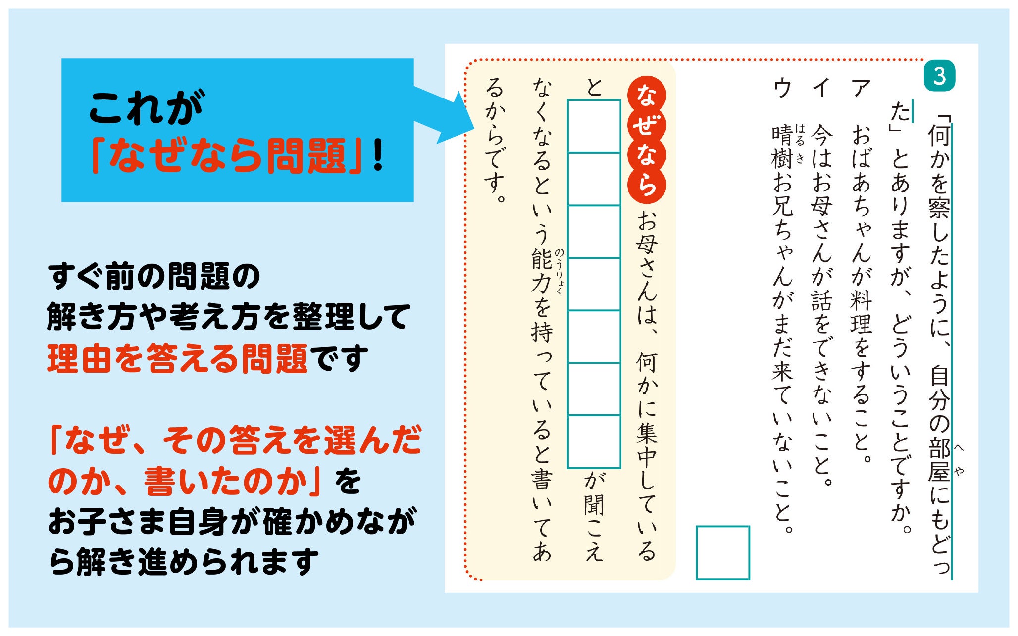 子どもたちが文章読解問題に取り組む際、解答の理由を確認せず、正解と不正解を繰り返してしまうことが多くあります。本書は「なぜなら問題」によって、「なぜ答えがそうなるのか」「なぜその答えを選んだのか」を、子ども自身が確かめながら取り組むことができる文章読解ワークブックです。