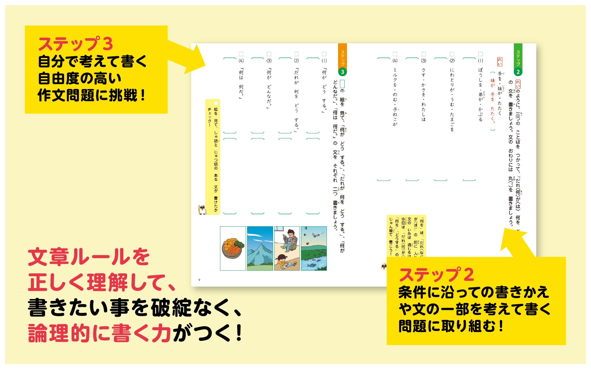 「なぜだと思う?」「どうすればいいと思う?」などの問いかけに答えていくことで文章の誤りや改善点に気づき、3ステップで論理的に書く力を身につけることができます。