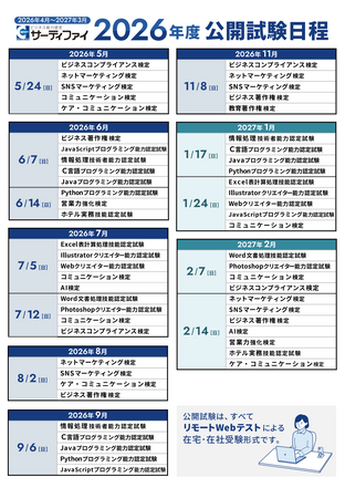 7分野30種類のビジネス資格・検定試験を主催する株式会社サーティファイ(本社:東京都中央区、代表取締役:瀧澤茂)は、2026年度の公開試験日程を発表いたしました。