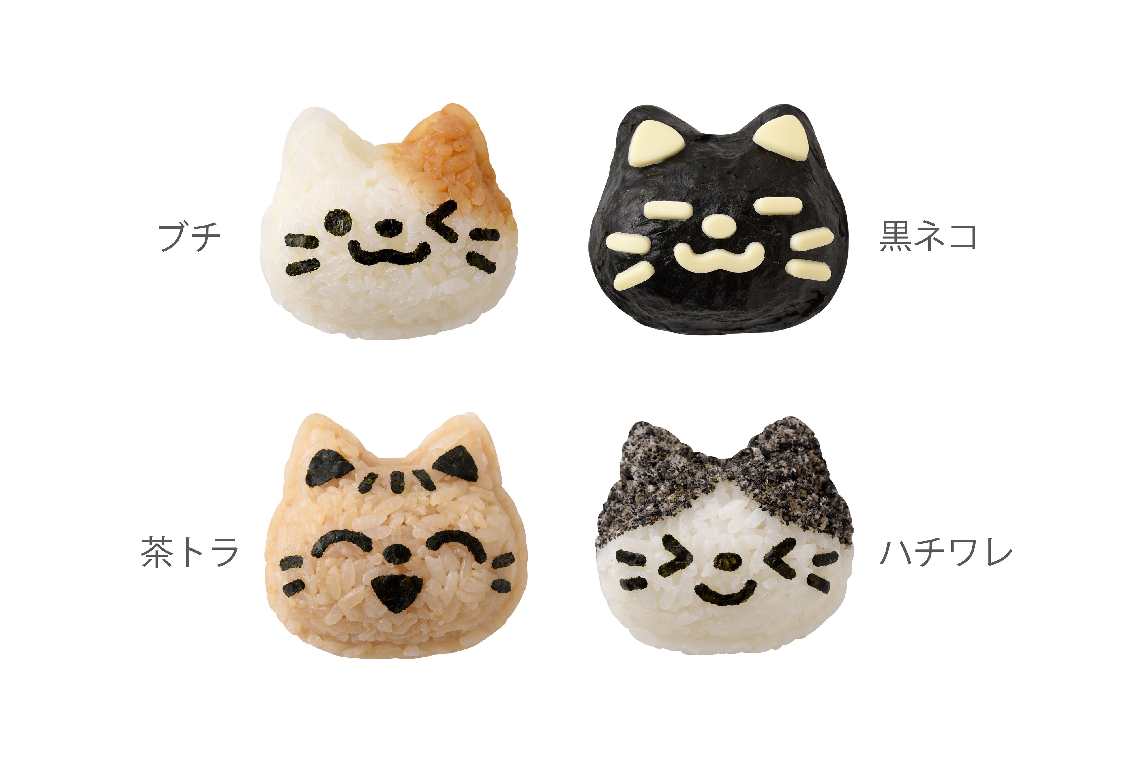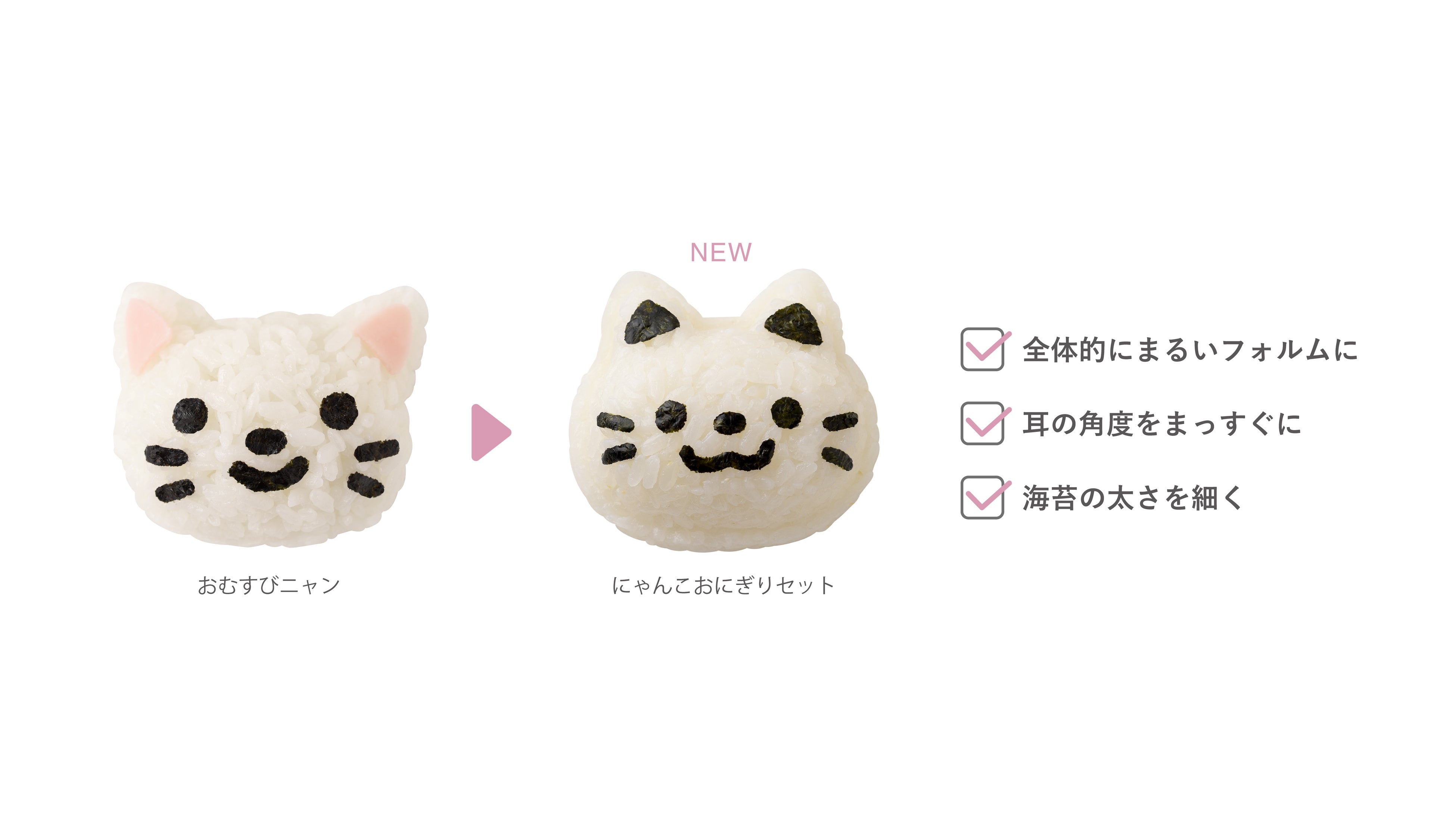 「にゃんこおにぎりセット」は当社のロングセラー「おむすびニャン」をリニューアルしたアイテム。従来の親しみやすさはそのままに、お顔の輪郭や耳の形を一から考え直し、シンプルでやさしいフォルムにリデザインしました。