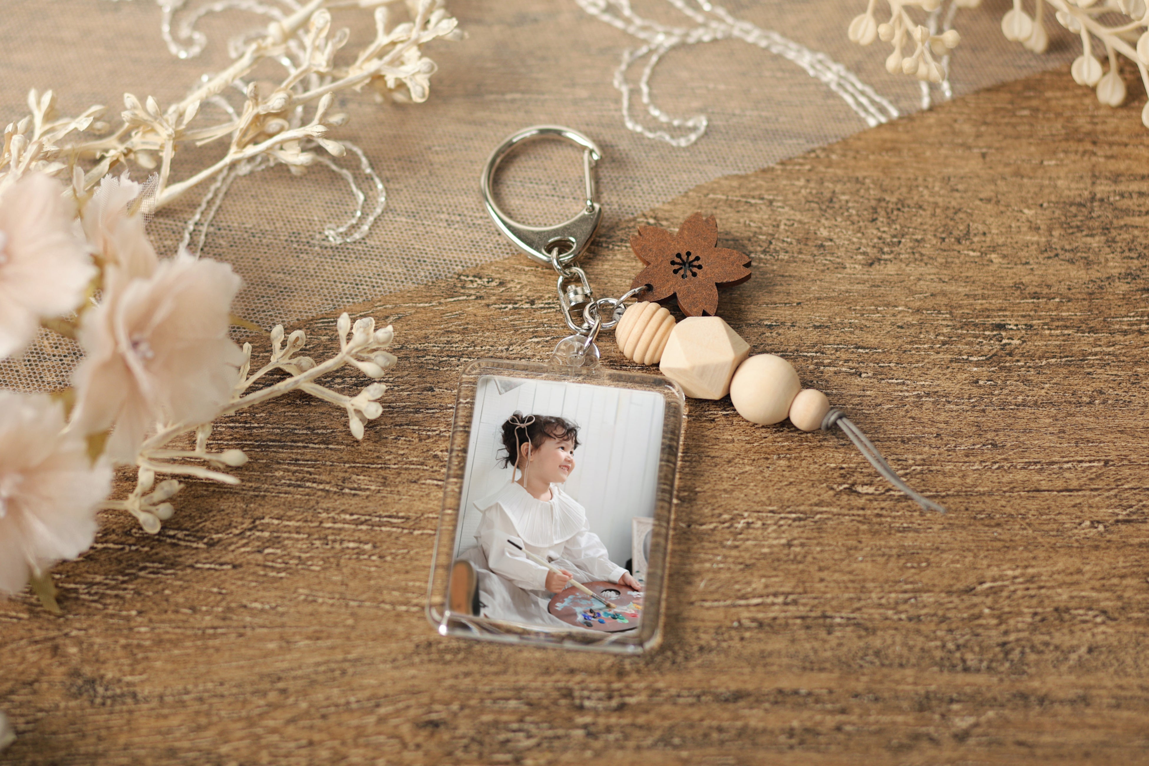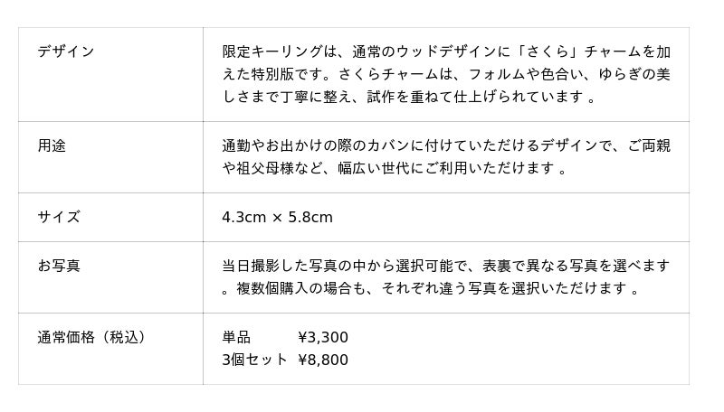 photo maison toctocでは、お子様の「ご入園」「ご入学」「ご卒業」という大切な門出の成長を記録し、その思い出を日常の中で感じていただきたいという思いから、この春にふさわしい限定版アイテムを企画いたしました 。今回、toctocで初めてとなる新デザインの商品として、記念撮影の思い出を日常使いしていただけるよう、限定キーリングを開発 。どんな方にも似合うウッドタイプ をベースに、試作を重ねて仕上げた「さくら」チャームを加えた特別仕様とし 、大切なご家族の記念のひとつとしてご提案いたします 。