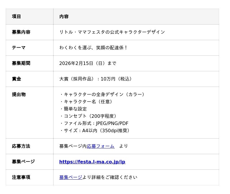 「リトル・ママフェスタ」の会場には、子育てに奮闘するママ・パパ、好奇心いっぱいの子どもたち、さまざまな家族の姿があります。ハイハイレースで一生懸命進む我が子を応援する声、おひるねアートでのかわいい姿の瞬間をとらえようとするママ・パパ、ステージイベントで一緒に踊る親子の笑顔。会場では、かけがえのない家族の思い出がたくさん生まれています。私たちは、この特別な時間をもっと「わくわく」するものにしたいと考えています。会場に足を踏み入れた瞬間から「楽しい気持ち」になり「元気」になってほしい、次のイベントが待ち遠しくなる。そんなイベントを更に盛り上げる存在として、全国のファミリーに寄り添い、笑顔を届けてくれる公式キャラクターを一緒に作り上げていきたいという思いから今回の「公式キャラクター」デザイン募集を実施することといたしました。