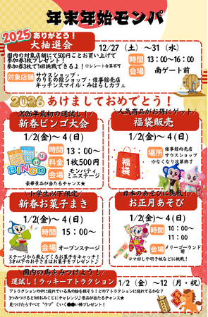 本イベントでは、一年の感謝を込めた「大抽選会」を年末31日まで実施するほか、年明け1月2日からは「新春ビンゴ大会」や「お菓子まき」など、新年の幕開けを祝う企画を多数ご用意。