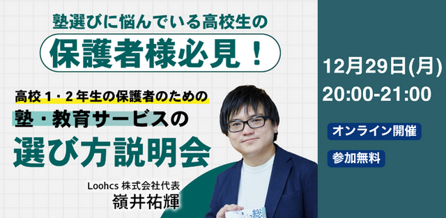 こうした状況を受け、Loohcs志塾は「どの塾が良いか」ではなく「どう選ぶべきか」を整理する視点こそが、今あらためて必要だと考え、2025年12月29日(月)に年末特別企画としてオンライン説明会を開催します。
