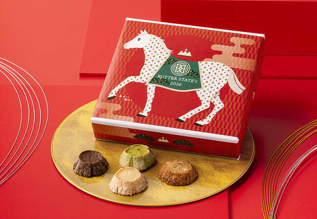 2021年グランドオープン以来 累計900万個販売を突破した東京発のバタースイーツ専門店「バターステイツ by銀のぶどう」。バターを極限までたっぷりと練りこんで焼き上げた代表作『バターステイツクッキー』をはじめ、様々なバタースイーツを手掛けています。そんな「バターステイツ by銀のぶどう」から、2026年の干支「午」が描かれたお正月限定の詰合せが登場。おめでたい紅白カラーの中央には、幸運を呼び込むといわれる“白い馬”が!「今年もきっとうまくいく」そんな気持ちを込めたギフトです。