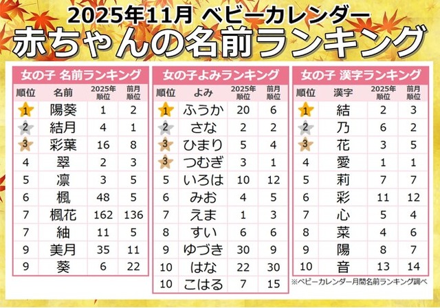 2025年11月に生まれた女の子の名前ランキングTOP5は、1位「陽葵(ひまり)」、2位「結月(ゆづき)」、3位「彩葉(いろは)」、4位「翠(すい)」、5位「凛(りん)」という結果となりました。なかでも「彩葉」は、10月の8位から11月は3位へとランクアップ。さらに、紅葉シーズンを迎える11月らしい名前として「紅葉(もみじ)」が10月のTOP100圏外から11月は78位へ新たにランクインするなど、季節の彩りを思わせる名前が多く見られました。