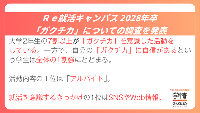 株式会社学情(本社:東京都中央区)は、2028年3月卒業(修了)予定の大学生・大学院生を対象に、「就職活動における『ガクチカ(学生時代に力を入れていること)』」についてインターネットアンケートを実施しました。今回の調査では、7割以上が何かしら「ガクチカ」を意識した活動をしていると回答しました。中でも「アルバイト」を上げる学生最も多い結果に。一方で約9割の学生が自分の「ガクチカ」に自信がない・自信を持てるかわからないという結果に。活動の一方で何かしらの課題を抱えていることがわかりました。