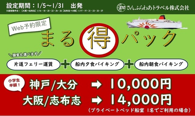 さんふらわあトラベル株式会社(社長:大西 康人、本社:大阪府大阪市住之江区)は、2026年1月限定でお得な旅行商品「さんふらわあ まる得パック」を販売しております。