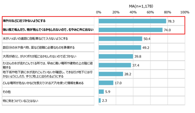 あなた自身、もしくはお家の人と一緒に、台風や大雨の日にどんなことに気を付けていますか。