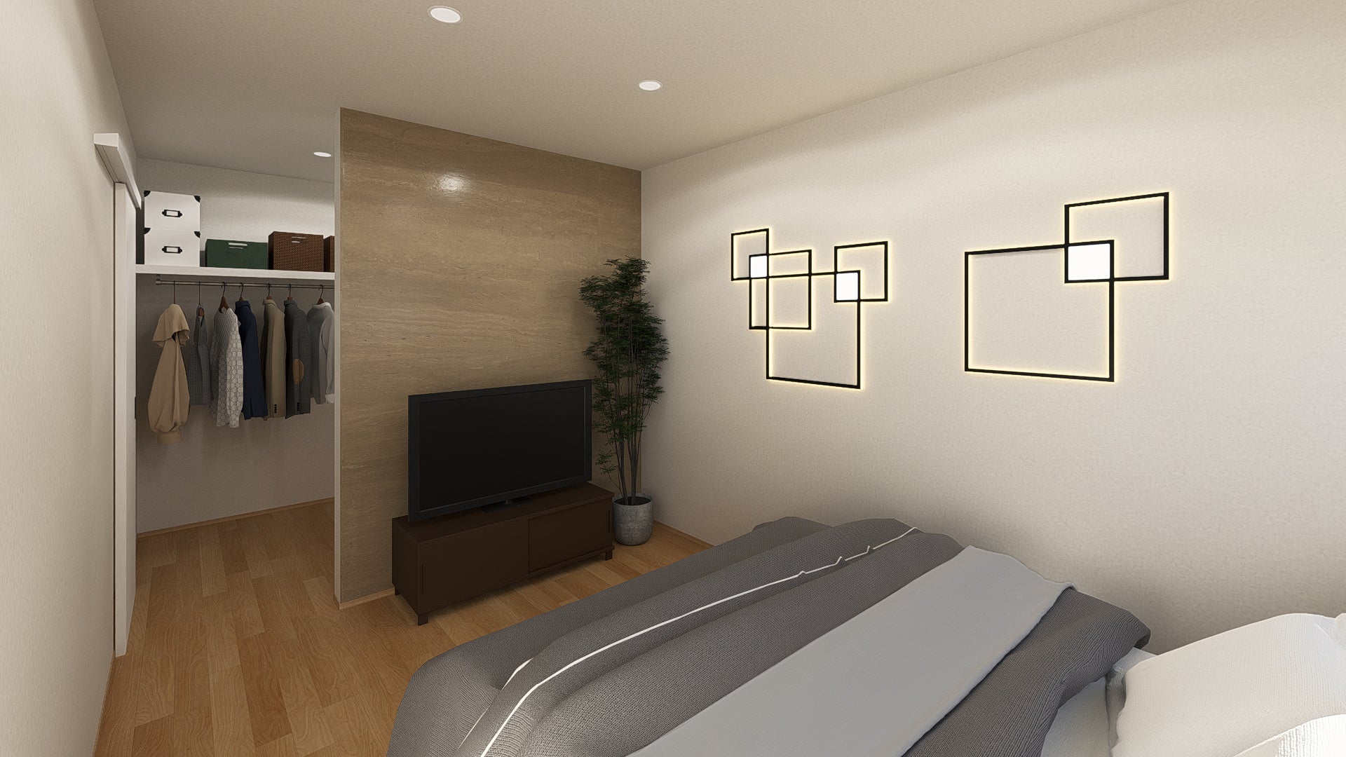 モノトーンで設えた、落ち着きのある寝室。 6帖の居室スペースに加え3帖のウォークインクローゼットを備えた、 日々の慌ただしさをそっと手放せる、ゆとりある空間に仕上げました。
