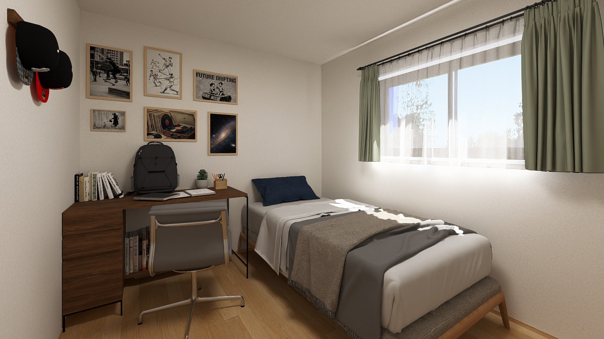 自分の”好き”で彩る子ども部屋。シンプルな設えだからこそ好きなものが映える子ども部屋。 今は子ども部屋、将来は趣味室にも。 家族の構成に合わせて使い方を変えられる、ライフスタイルに寄り添う住まいです。