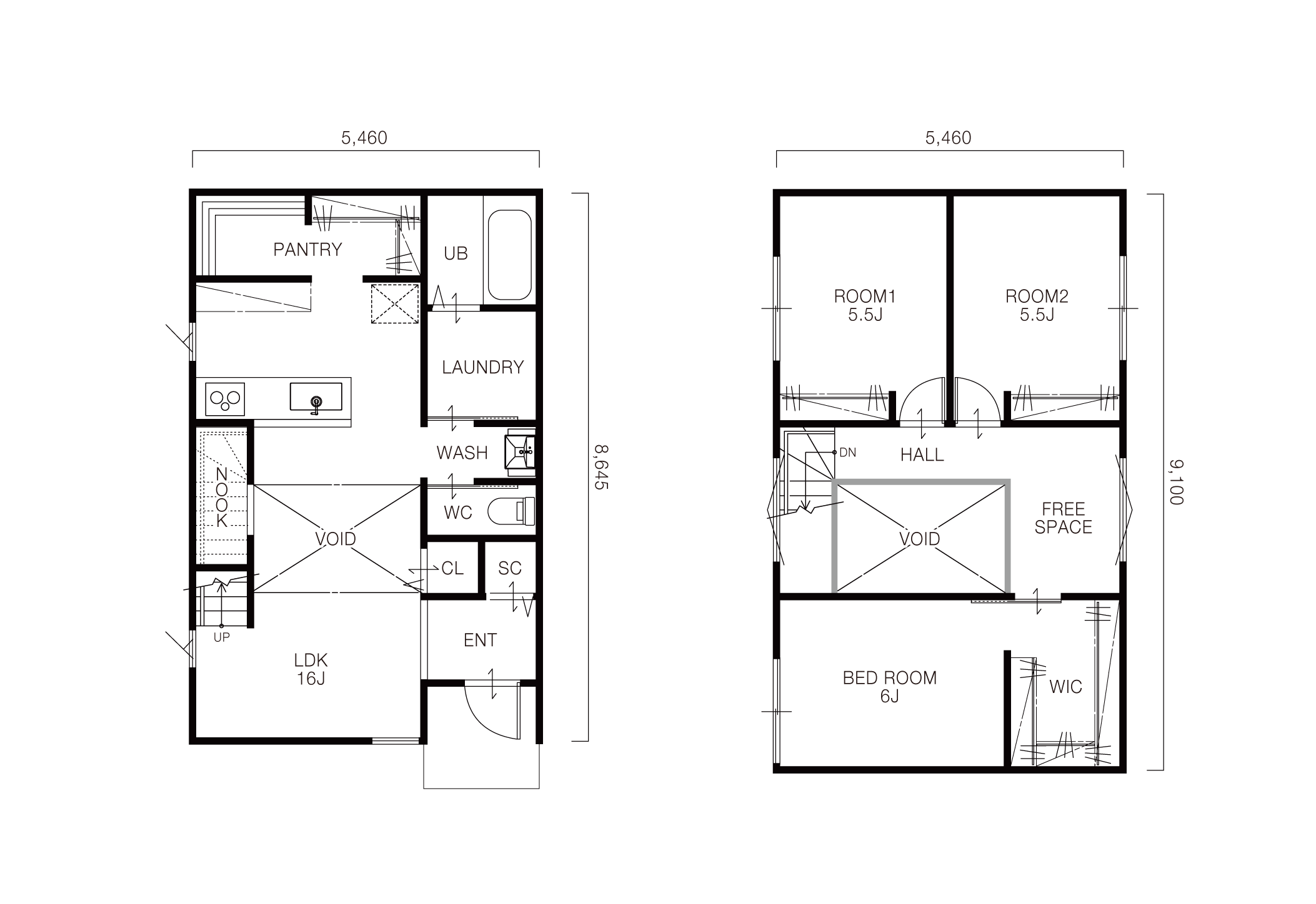 吹き抜けでつながる2階フロアには、大容量のWICを備えた寝室と5.5帖の洋室2部屋を完備。 家族構成の変化やライフスタイルに合わせて柔軟に対応可能な設計です。