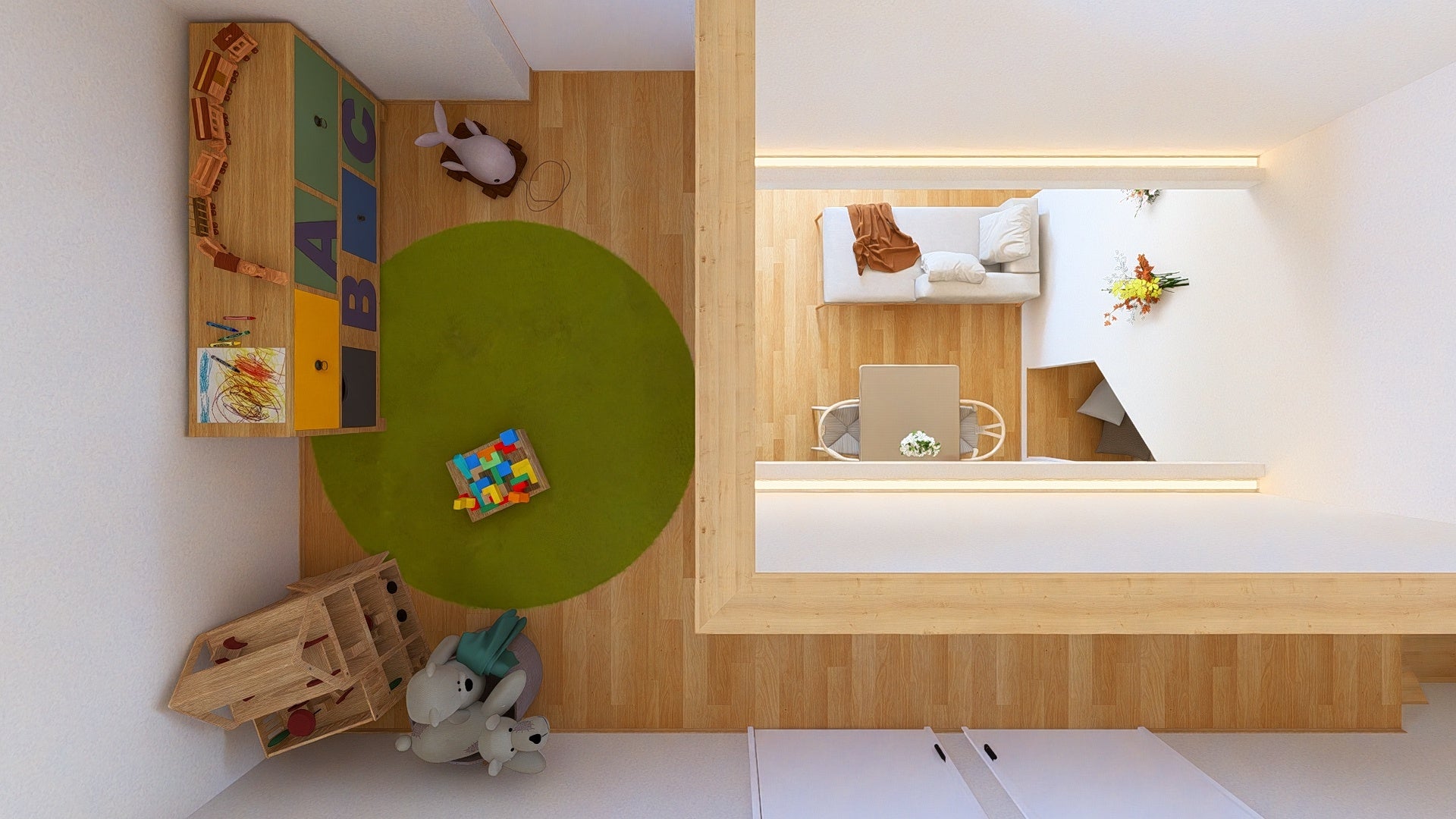 階下とのつながりを感じられるフリースペース。吹き抜けを通して楽しく遊ぶお子様の声が響く。 3帖ほどの広さで、家族の成長に合わせて用途を変えていけるフレキシブルな空間。