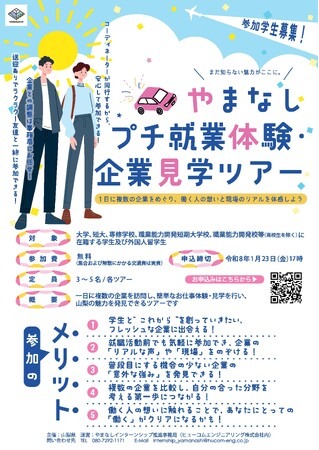 この度、企業と学生のマッチングの場として「やまなしプチ就業体験・企業見学ツアー」を開催します。本ツアーでは、県内企業を1日で複数訪問し、働く人の想いや現場の様子を体感できます。企業との調整や送迎は事務局がサポートするため、安心して参加でき、就職活動前の業界研究やキャリア形成に役立つ有意義な機会となります。