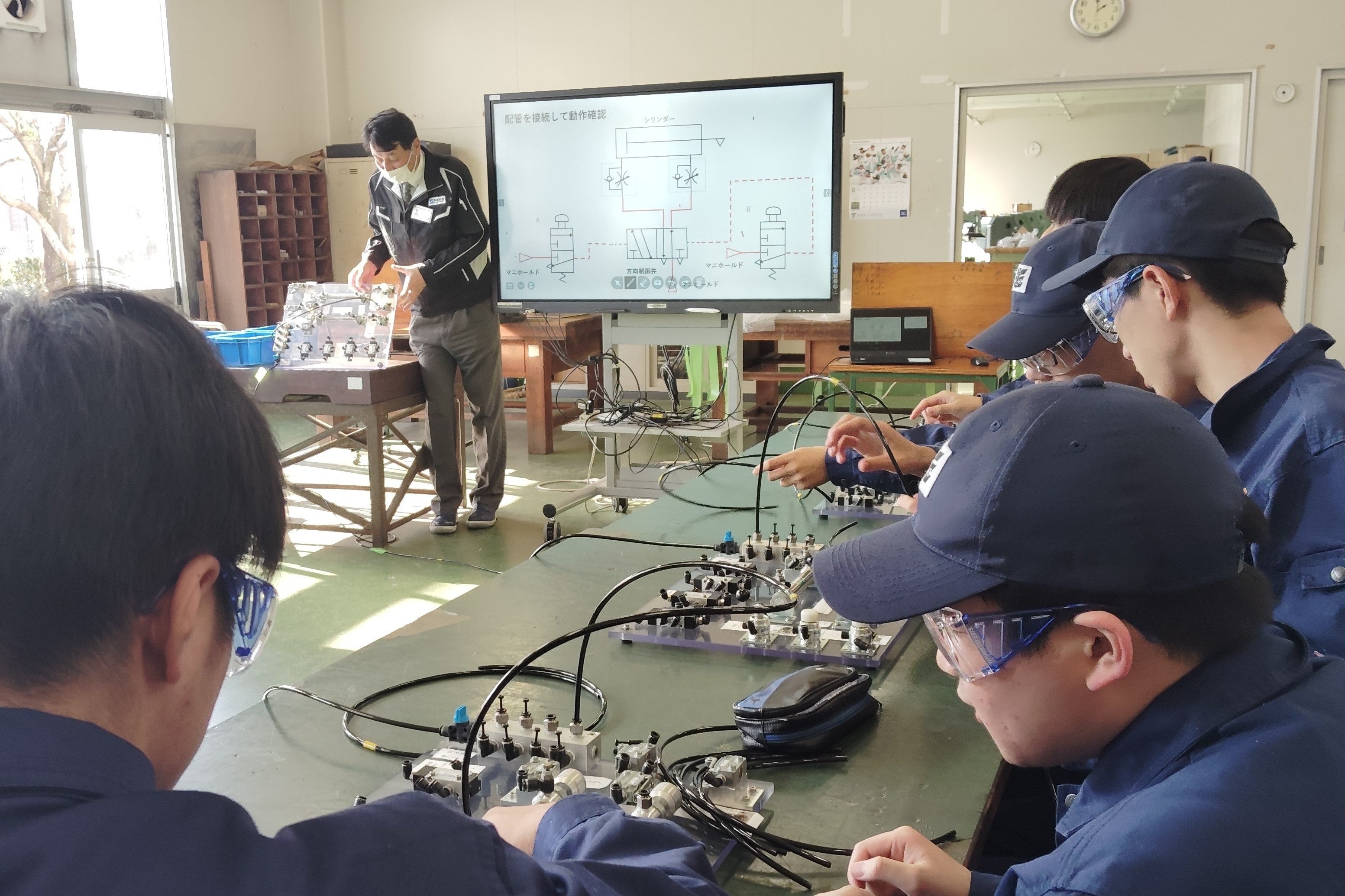 熊本県立玉名工業高等学校機械科1年生の生徒40名に半導体のエンジニア派遣実習を実施。熊本テクノセンターの担当者より、機械のメンテナンスについての説明や空圧回路実習、LED点灯回路の作成など、実際に当社研修で使用している器具を用いた実習を行いました。