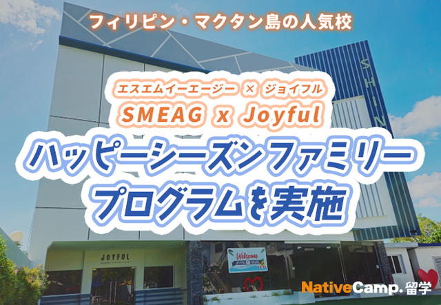 ネイティブスピーカーと回数無制限のオンライン英会話サービス「ネイティブキャンプ英会話」を展開する株式会社ネイティブキャンプ(東京都渋谷区 代表取締役: 谷川国洋)は、海外留学エージェントサービス「ネイティブキャンプ留学」において、フィリピン・マクタン島の人気校「SMEAG Encantoキャンパス」と「Joyful T-Shineキャンパス」が共同で、ハッピーシーズンファミリープログラムを実施いたします。
