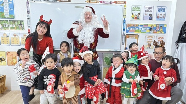 一日の締めくくりには、サンタクロース(外国人講師)がサプライズで登場。一人ひとりプレゼントを受け取り、子どもたちの輝く笑顔とともに特別な一日は幕を閉じました。