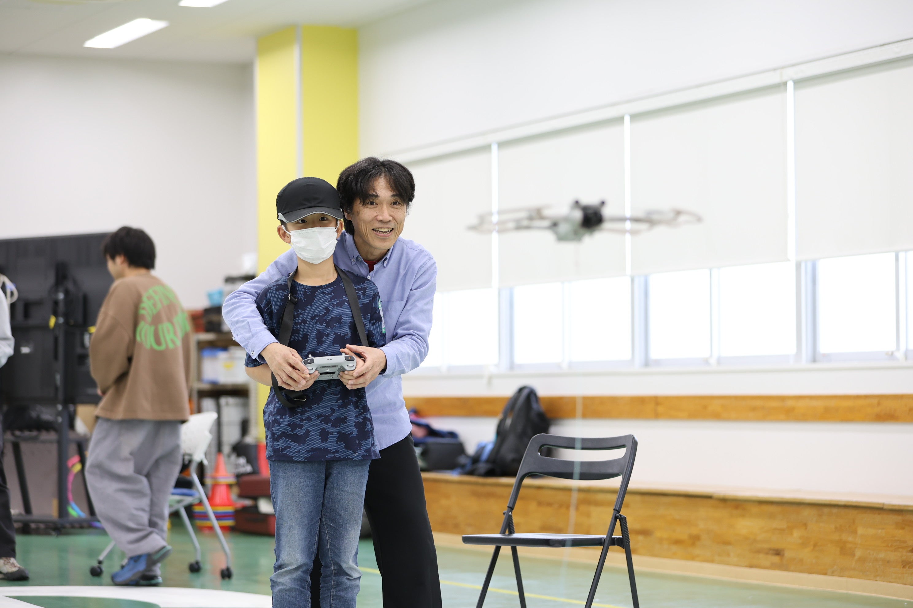 ドローン操作を一緒にする専門学生と小学生