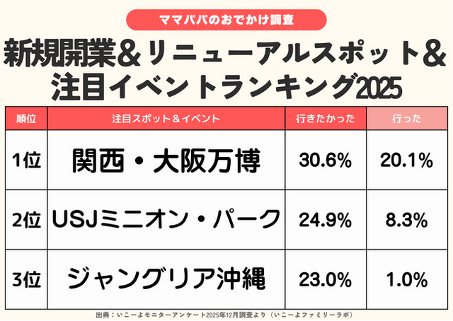 子育て世帯が2025年に注目したニュー&リニューアルオープンスポットの特徴はどのようなものがあるのでしょうか? 行きたかったけれど実際にはいけなかった理由は? などについて紹介します。