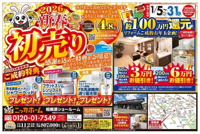 全国100店舗以上展開!2026年に創業39周年を迎える、リフォーム&増改築 ニッカホーム株式会社 (本社:愛知県名古屋市緑区篭山、代表取締役社長:西田裕久、以下 ニッカホーム)の関東エリア・ニッカホーム相模原ショールーム にて、26年1月5日より「新春初売りキャンペーン」を開催します!