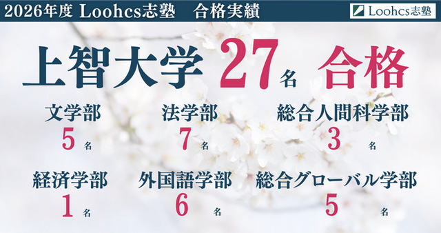 総合型選抜・推薦入試専門塾「Loohcs志塾(ルークス志塾)」は、2026年度入試において、上智大学の推薦入試にて合計27名の合格者を輩出しました。法学部・文学部・外国語学部・総合グローバル学部など、上智大学の主要学部において、幅広い分野での合格実績となりました。
