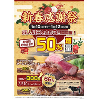 1月10日(土)~12日(月)にて「新春感謝祭」を開催。「サーロインステーキ」を、お値段そのまままで、通…