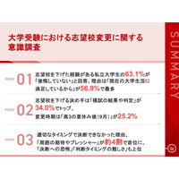 【大学受験における志望校変更の実態調査】志望校を下げた私立大学生の63.1%が「後悔していない」と回答一方、決断タイミングに悩んだ学生の約4割が「周囲のプレッシャー」を理由に挙げる