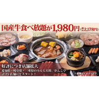好評につき店舗拡大!国産牛食べ放題コースが1,980円(税込2,178円)。国産牛カルビや国産牛モモなど50品以上のラインアップ