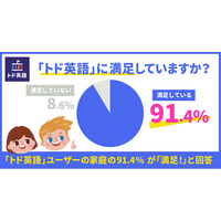 【子ども向け英語学習アプリ「トド英語」顧客満足度調査】「トド英語」ユーザーの家庭の91.4%が「満足!」と回答