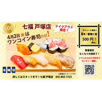 4/2(木)8貫+巻物1本が500円(税込)!寿司居酒屋の「七福 戸塚店」