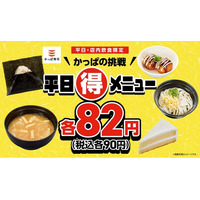 春休みもお得はつづく!かっぱの挑戦 平日(得)メニュー!おにぎり・うどん・味噌汁・クリームケーキ・たこ焼きが税込各90円!春休みの平日は、ご家族やご友人とお得な税込各90円を満喫しよう!