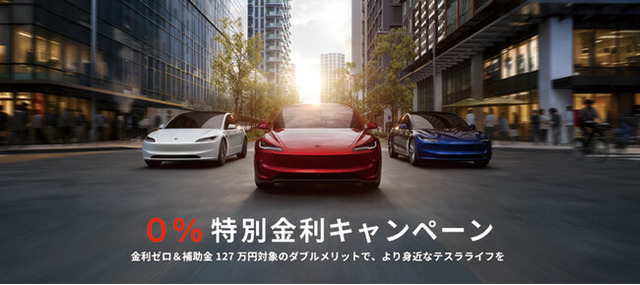 【注意事項】2026年1月1日以降、3月31日までに当社指定の車両を購入し、2026年3月31日までに納車完了することで金利 0%(最大 5 年)が適用されます。借入期間が5年を超える場合には、金利2.4%となります(借入期間最大 10 年)。本キャンペーンは当社指定のローン会社による審査が必要となります。テスラの車両を新車で購入し、2026年3月31日までに新車登録した場合、国のCEV補助金127万円が適用されます。また、各自治体独自に補助金を設定している場合があります。詳しくはお住いの地方自治体ホームページをご確認ください。補助金の申請条件、および予算額の最新情報については事前にご確認ください。本キャンペーンが適用されるのは当社指定の車両に限ります。また、本プログラムは予告なく変更また終了する場合があります。ご注文日や登録手続・車両準備などに要する時間によっては期限内に納車ができない場合がございます。当社は当該期日までに納車完了することを保証いたしません。理由の如何を問わず期日を過ぎた後に納車となった場合は本キャンペーンは適用されませんので予めご了承ください。2025年12月31日までの未納車のご注文をお持ちの場合、その注文をキャンセルして本キャンペーン適用となる注文を入れることはできません。また、中古車と業務用車両は対象外です。