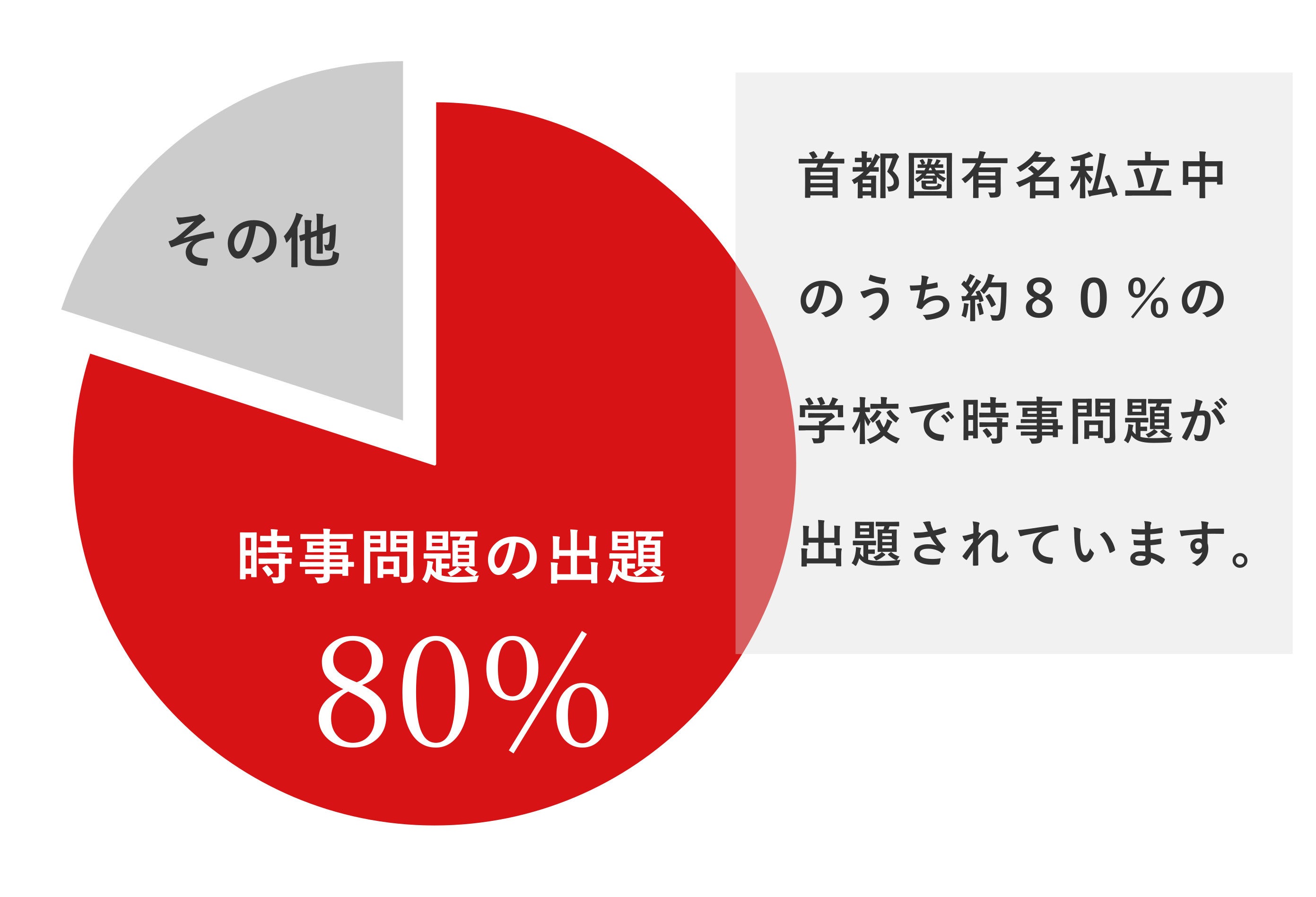 近年、時事問題は大半の学校で出題されています。特に社会ではその傾向が顕著で、昨年度の入試でも、首都圏有名私立中のうち約80%の学校で時事に関する問題が出題されました。難関中をめざすのであれば、時事問題の対策は、やって当たりまえのものになっています。