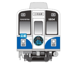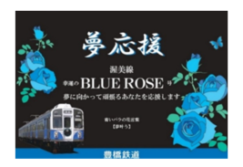 内容:渥美線「1804号(ひまわり)」を、期間限定で「夢応援・幸運のBLUE ROSE号」として運行します。車内ポスター(中吊り・ドア横)には豊橋市内3大学(愛知大学、豊橋技術科学大学、豊橋創造大学)の学生の皆さまからの手書き応援メッセージを掲出します。また車両正面には“応援”の文字を掲げた特別な種別板やヘッドマークを掲出し、側面は青いバラをあしらったデザインのシートを掲出します。